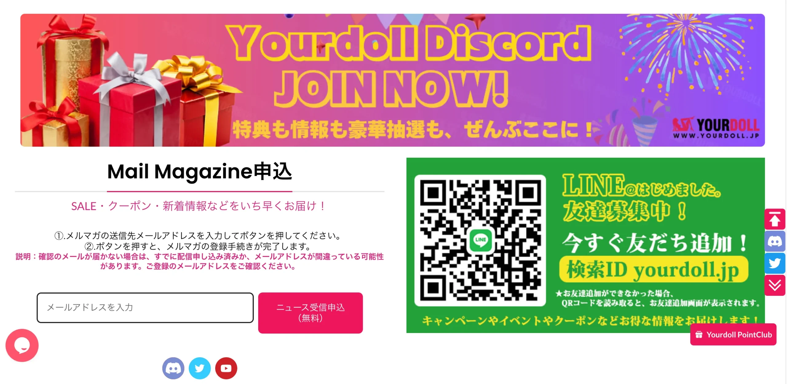 YourDollは、購入前の相談窓口(チャット・メール)や、キャンペーン告知、問い合わせ先の明示など、「不安が出やすい部分を先に説明する設計」になっています。だから口コミで注目したいのは、次のような“運用の痕跡”です。